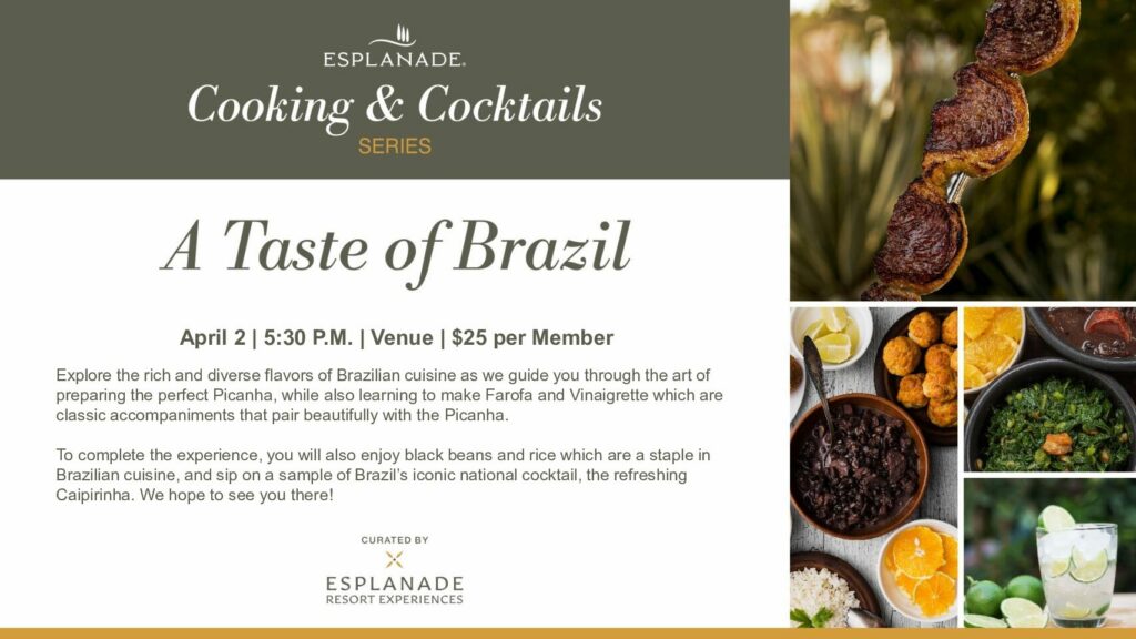 To complete the experience, you will also enjoy black beans and rice which are a staple in Brazilian cuisine, and sip on a sample of Brazil’s iconic national cocktail, the refreshing Caipirinha. We hope to see you there!