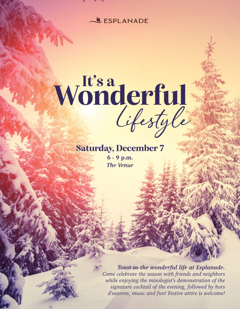 Toast to the Wonderful life at Esplanade. Come celebrate the season with friends and neighbor’s while enjoying the mixologist’s demonstration of the signature cocktail of the evening, “The Grinch”, followed by hors d’oeuvres, music, and fun! Festive attire is welcome!