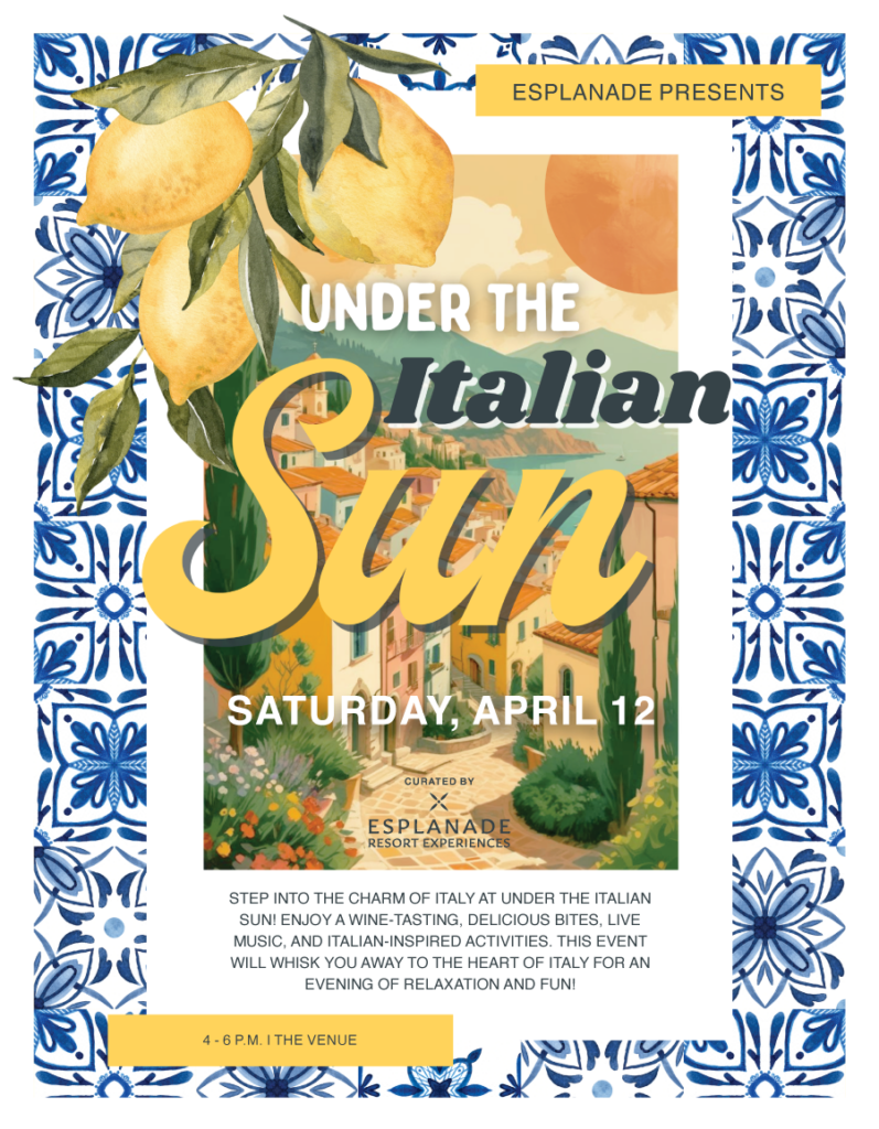 STEP INTO THE CHARM OF ITALY AT UNDER THE ITALIAN SUN! ENJOY A WINE-TASTING, DELICIOUS BITES, AND ITALIAN-INSPIRED ACTIVITIES. THIS EVENT WILL WHISK YOU AWAY TO THE HEART OF ITALY FOR AN EVENING OF RELAXATION AND FUN.